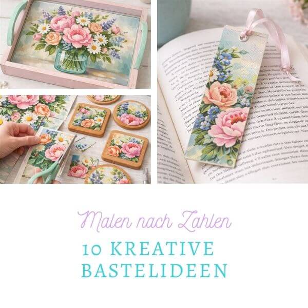 Ein besonders schönes Projekt sind Lesezeichen. Viele Malen-nach-Zahlen-Bilder enthalten kleine Details, Blumen oder Muster, die sich perfekt dafür eignen.