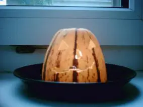 Halloween-Dekoration basteln: Die Schale des Spaghettikürbis war ziemlich hart, schließlich gelang es doch, ein Gesicht zu schnitzen.