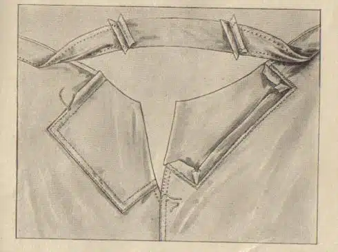 Auch das Bindeband ist zerrissen. Man trennt zunächst den Kollerbund ein Stück weit von dem Beinkleid aus und ersetzt die schadhaften Stellen durch angesetzte Stücke.