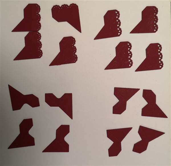 Lege die Stanzform auf dein Papier und führe sie durch die Stanz- und Prägemaschine. Oft erhältst du mit einem Stanzgang gleich mehrere Motive, z. B. 4 × 4 kleine Fotoecken in unterschiedlichen Designs.