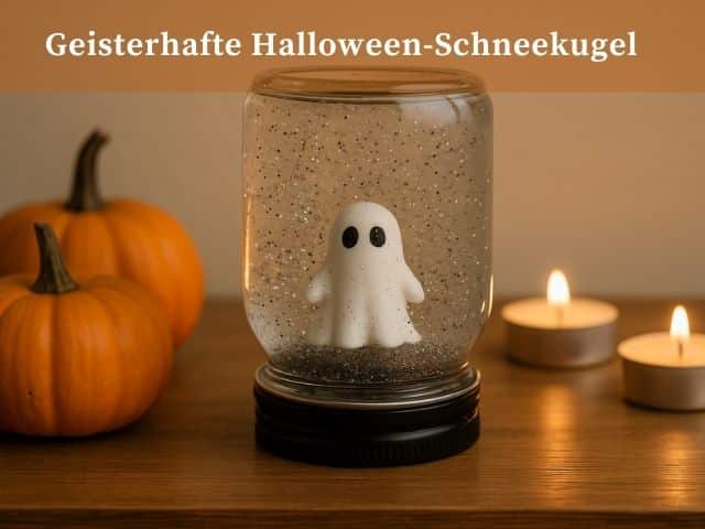 Die Schneekugel lässt sich ganz einfach abwandeln. Statt eines Geistes kann man zum Beispiel einen kleinen Kürbis einsetzen – so entsteht eine herbstliche Variante, die auch nach Halloween noch passt. Für eine geheimnisvolle Stimmung eignet sich Glitzer in Lila oder Grün, der der Kugel einen mystischen oder sogar leicht giftigen Charakter verleiht. Besonders effektvoll wird es, wenn man die Schneekugel auf einen LED-Untersetzer stellt: Mit wechselnden Farben wirkt das Ganze fast schon magisch und zieht alle Blicke auf sich.