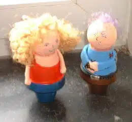 Auch diese beiden Tonis entstanden bei einem Bastelfrauentreffen. Während die Erwachsenen anderswo werkelten, bastelten meine Freundin Tanja und ich, zu diesem Zeitpunkt beide elf Jahre alt, ohne große Hilfe und klammheimlich unsere eigenen Tonis. Lediglich beim Umgang mit der Heißklebepistole halfen die „großen“ Bastelfrauen.