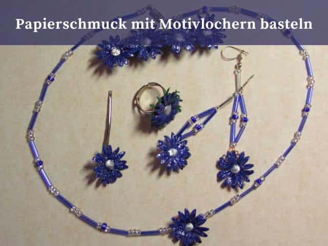 Mit einem einzelnen Motivlocher – der Margerite – hat meine Tochter hier ein ganzes Papierschmuck Set mit Kette, Ring, Haarspange, Haarklemme und Ohrringen gebastelt. Natürlich benötigt man noch weiteres Bastelmaterial wie Ringschiene oder Ohrhaken – insgesamt ist dies aber eine Möglichkeit, tollen Schmuck preisgünstig selbst zu basteln.