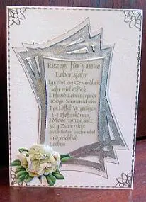 Verwendetes Bastelmaterial: geprägtes Tonpapier, Sticker, Spruch, 3 D Blumenmotiv. Den Spruch mittles PC auf die Stickergröße anpassen.
