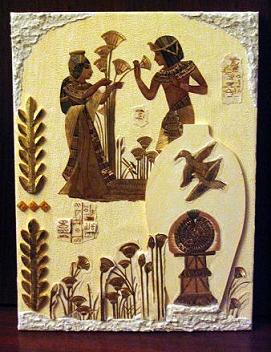Keilrahmen 20 x 40 , Tapete mit Ägyptischen Motiv, Vase aus MDF, 2 Reliefs aus MDF, Strukturpaste, Mosaiksteinchen, Vogelsand, 3D Abstandhalter