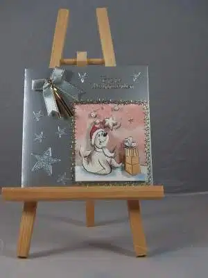 Vor einiger Zeit habe ich mir bei Zeemann verschiedene, preisgünstige Bastelsets für Weihnachtskarten mit 3D-Motiven gekauft. Teilweise habe ich die Karten so gebastelt, wie es von der Bastelpackung her vorgesehen war, teilweise habe ich die Bilder aber auch anders „eingesetzt“. Im ersten Beispiel habe ich eine silberne, quadratische Karte als Untergrund verwendet. Für das weitere Basteln habe ich dann noch Schleifenband, Sticker und ein 3D-Motiv benötigt, während die anderen Karten überwiegend mit dem Bastelmaterial aus der Packung hergestellt wurden.